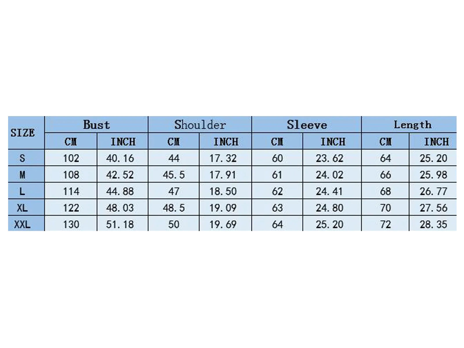 | Size:XXL | US Size:12 | UK Size:16 | EU Size:40 | Bust:130cm/51.18'' | Shoulder:50cm/19.69'' | Sleeve:64cm/25.20'' | Length:72cm/28.35'' |