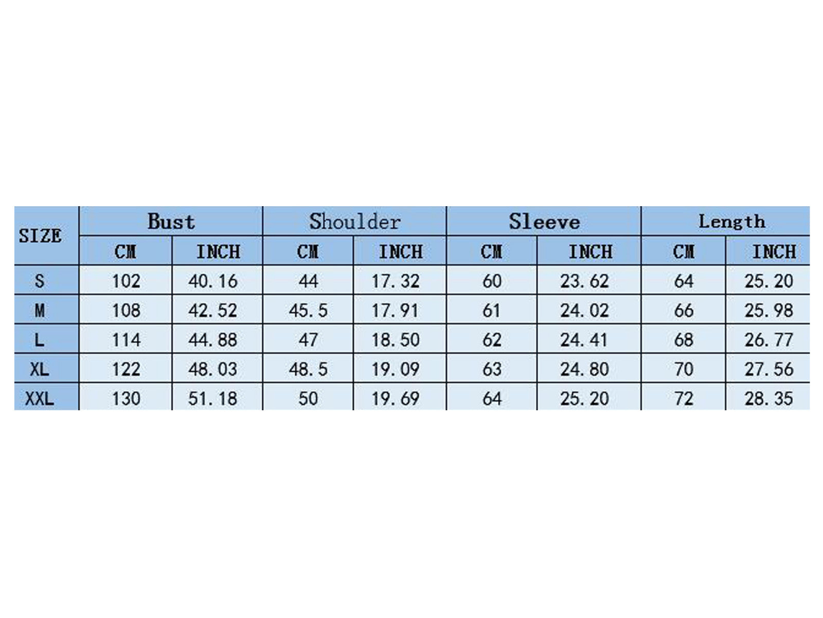 | Size:S | US Size:4 | UK Size:8 | EU Size:32 | Bust:102cm/40.16'' | Shoulder:44cm/17.32'' | Sleeve:60cm/23.62'' | Length:64cm/25.20'' |